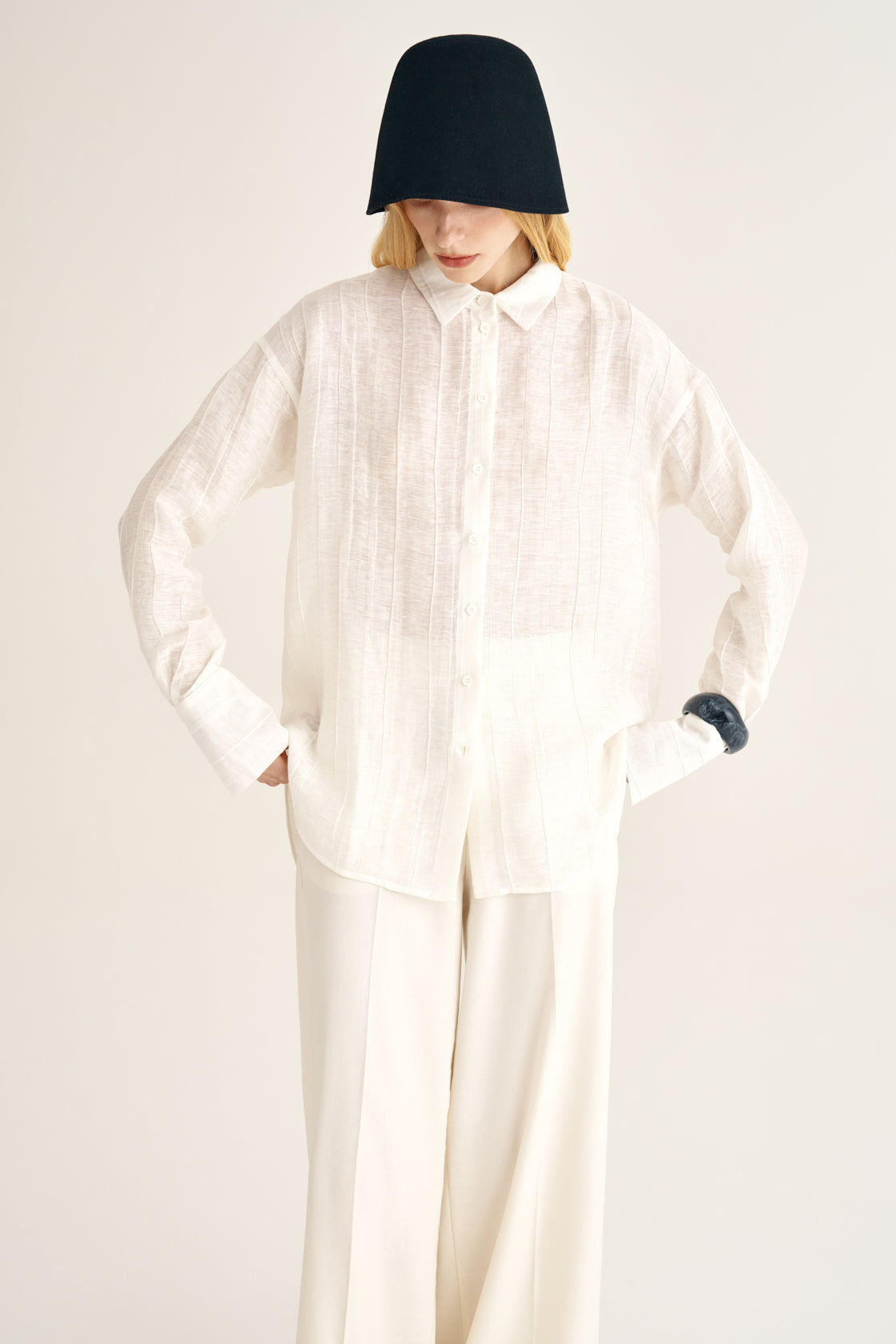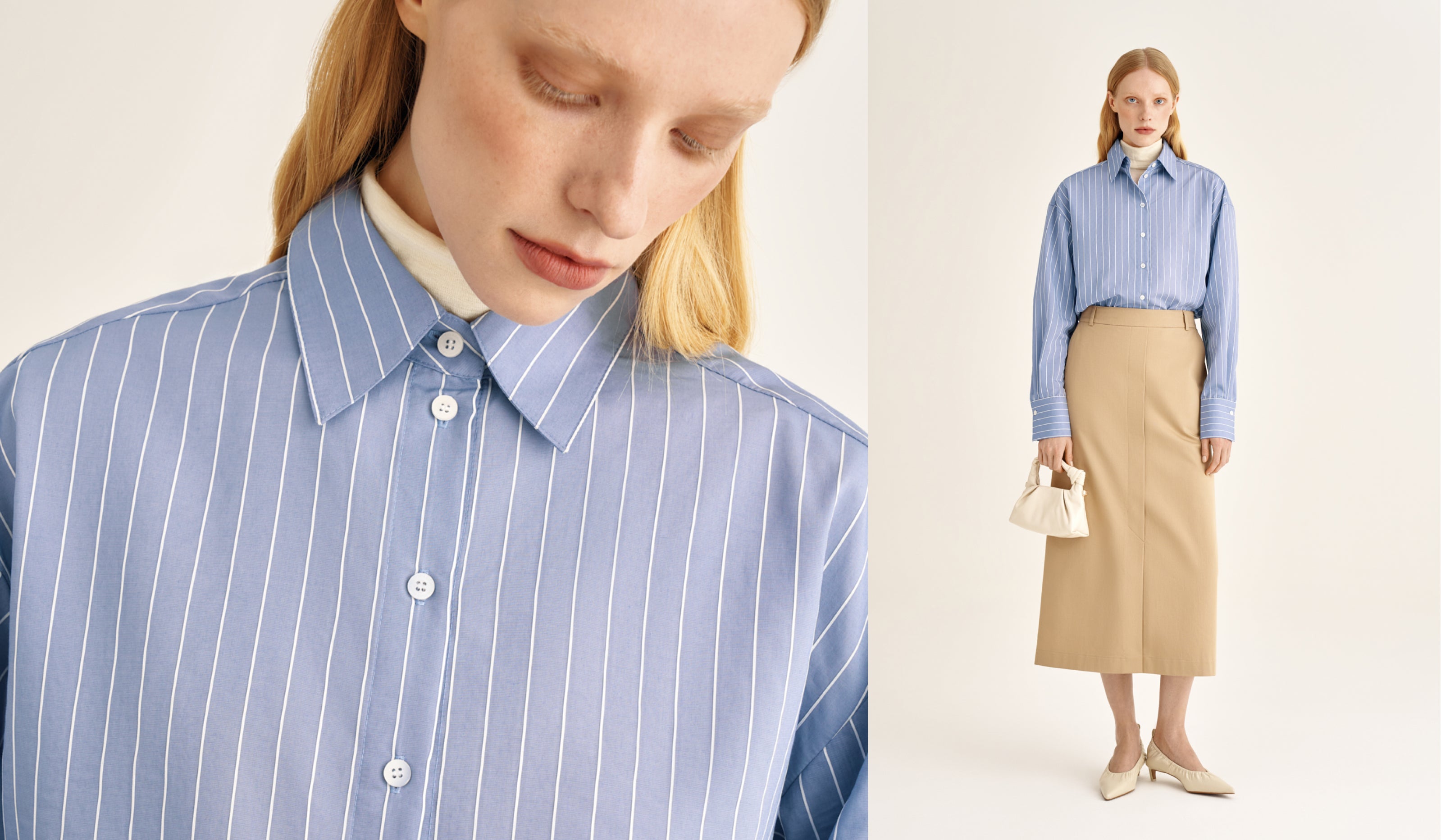 The CODE striped shirt combines precision tailoring with a feeling of total freedom. It is hand-cut, with the stripes on the cuffs and back perfectly aligned to maintain clean lines even in a relaxed silhouette.