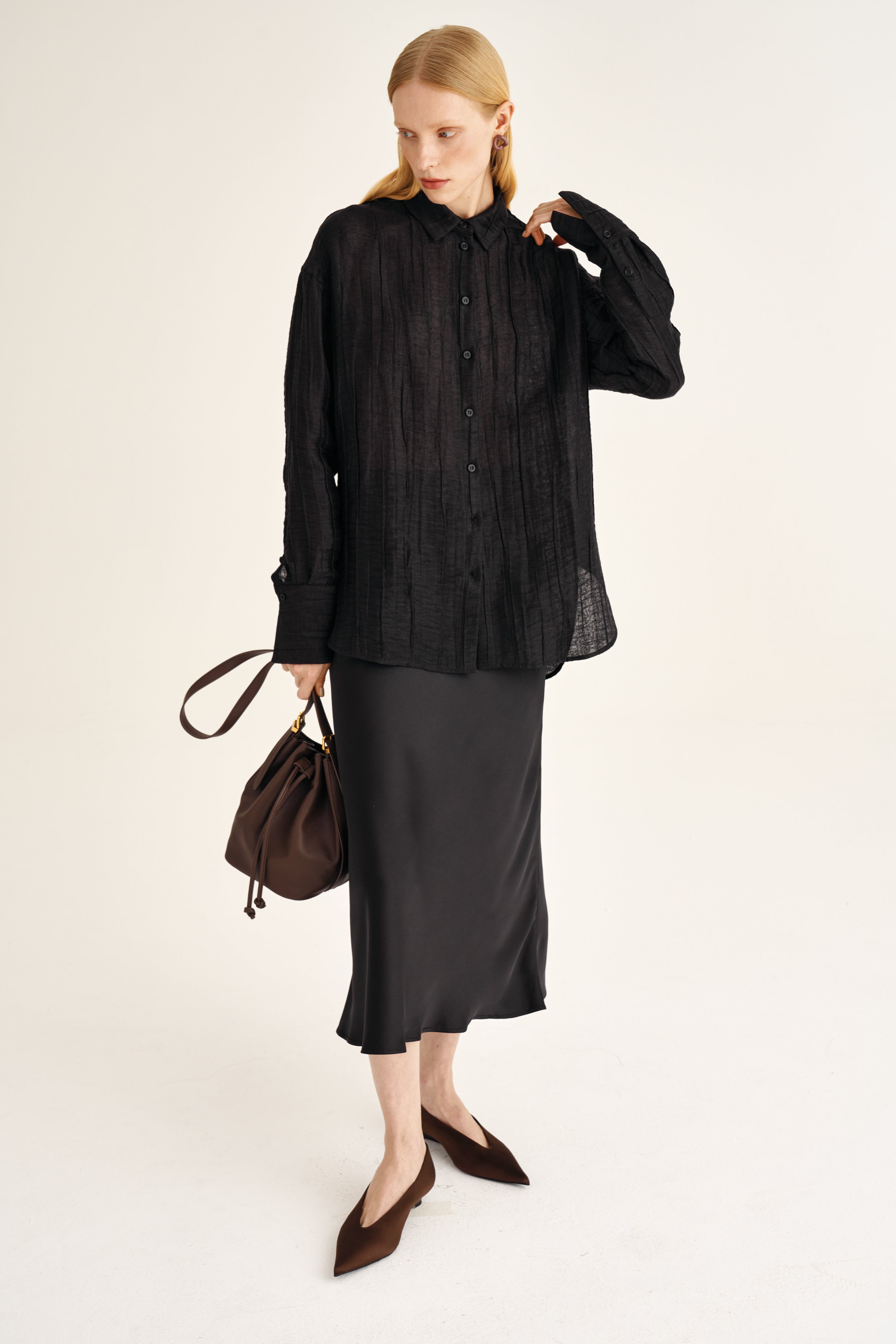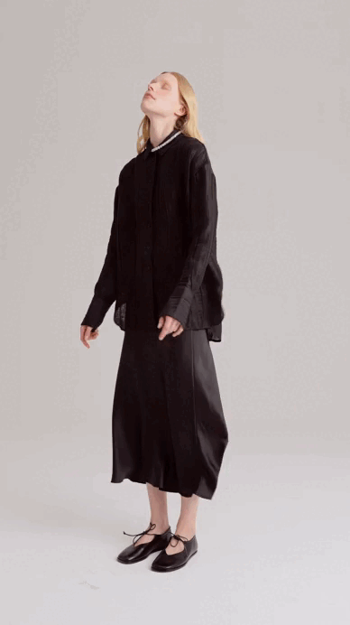 Another take on the dress: layered with a voluminous, lightweight black shirt, creating a relaxed and effortless effect. This look reflects the spirit of urban style and freedom.
