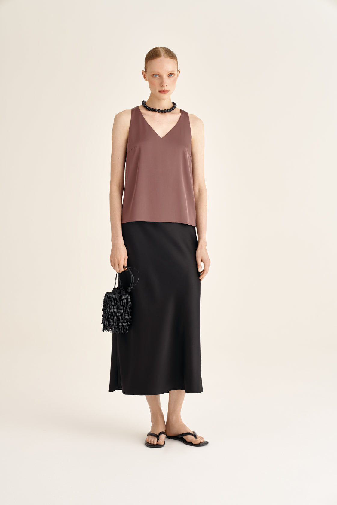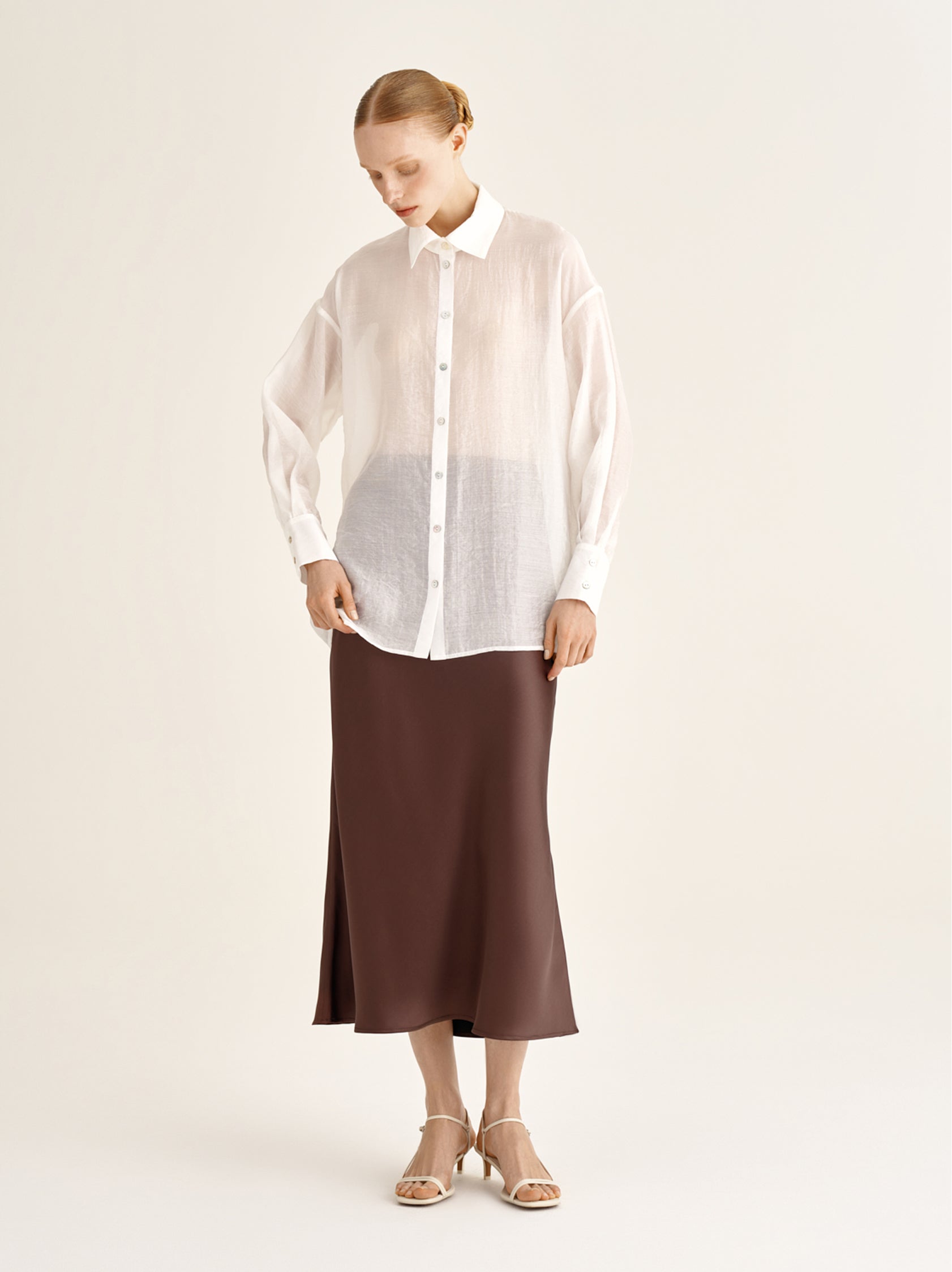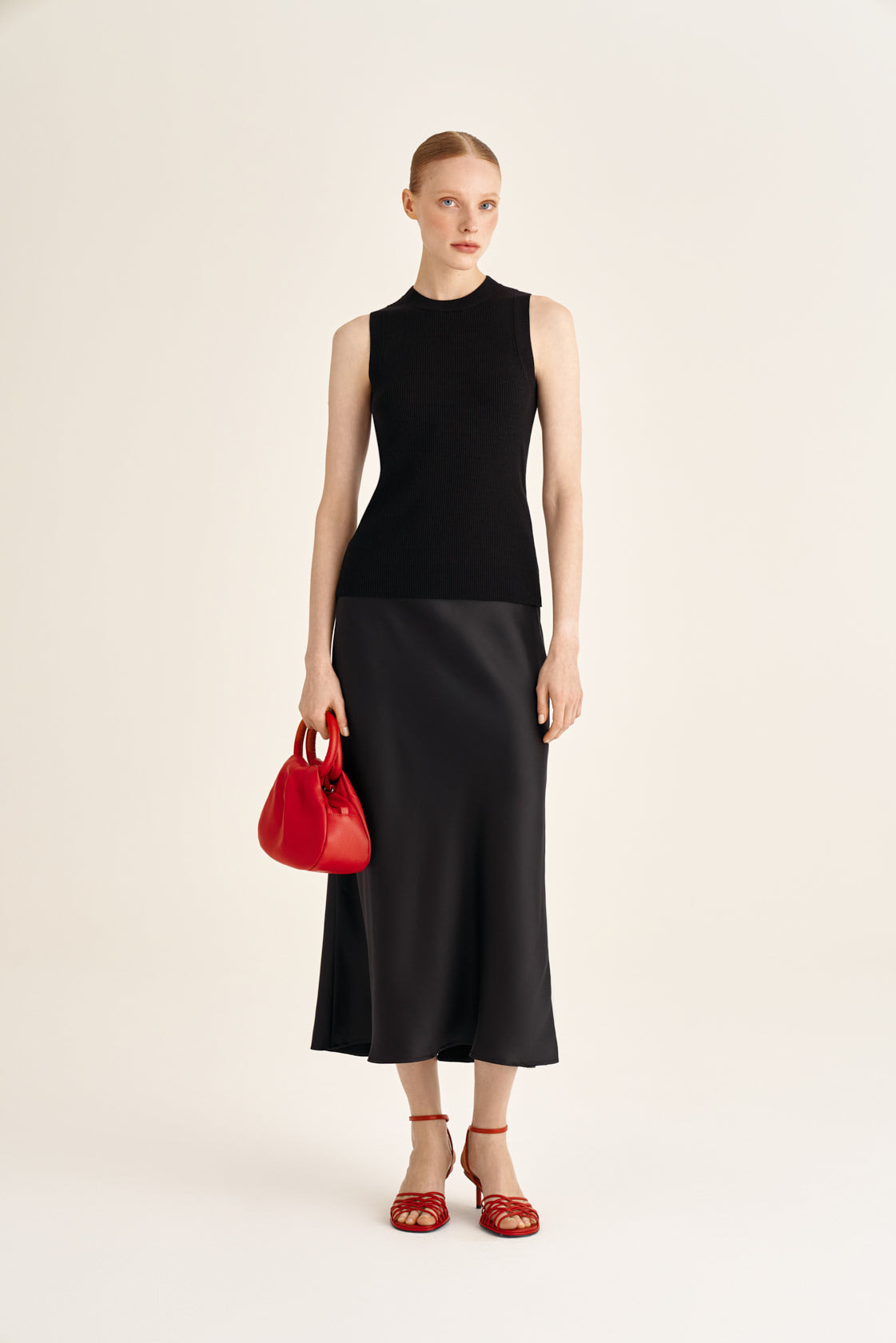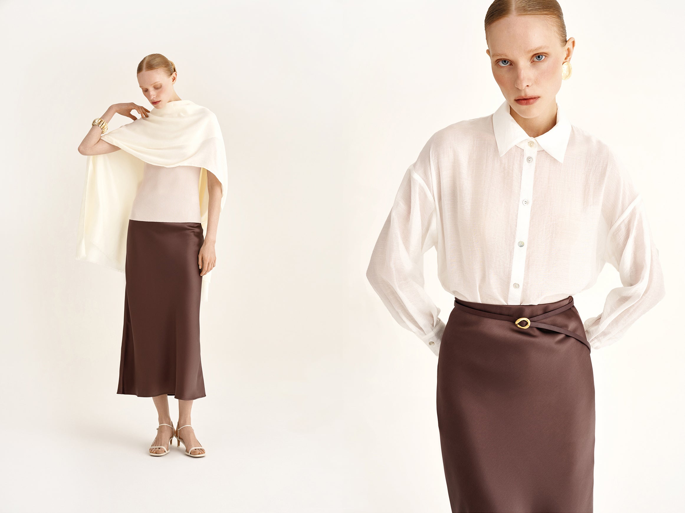 Skirt, top, and blouse — a trio that speaks one language of texture and form. The fluidity of satin, the structure of knitwear, the breathability of tencel — each brings its own rhythm, yet together they create a balanced, cohesive silhouette.