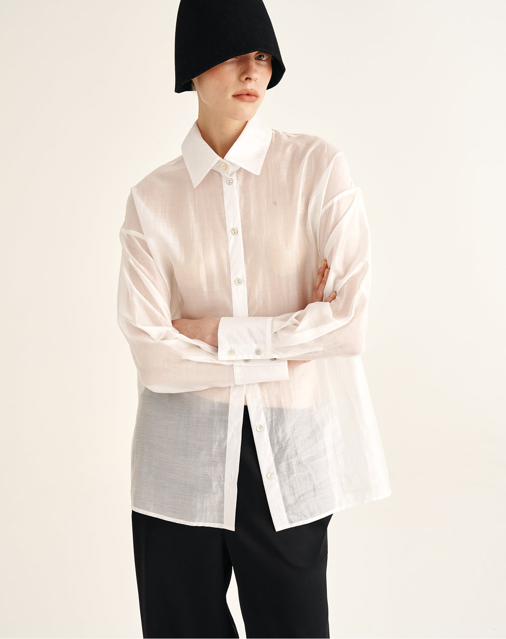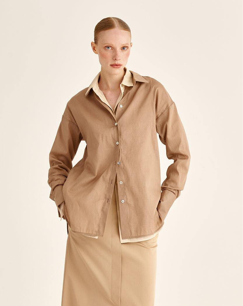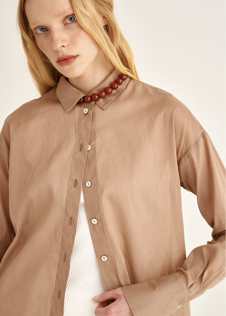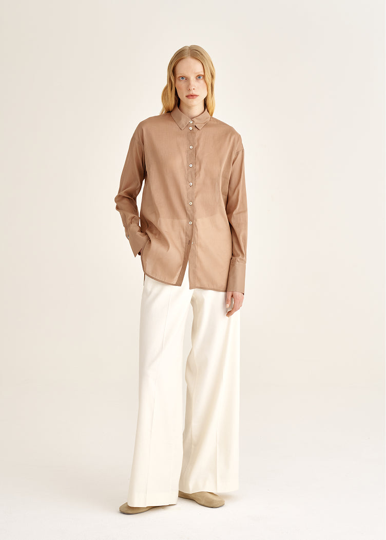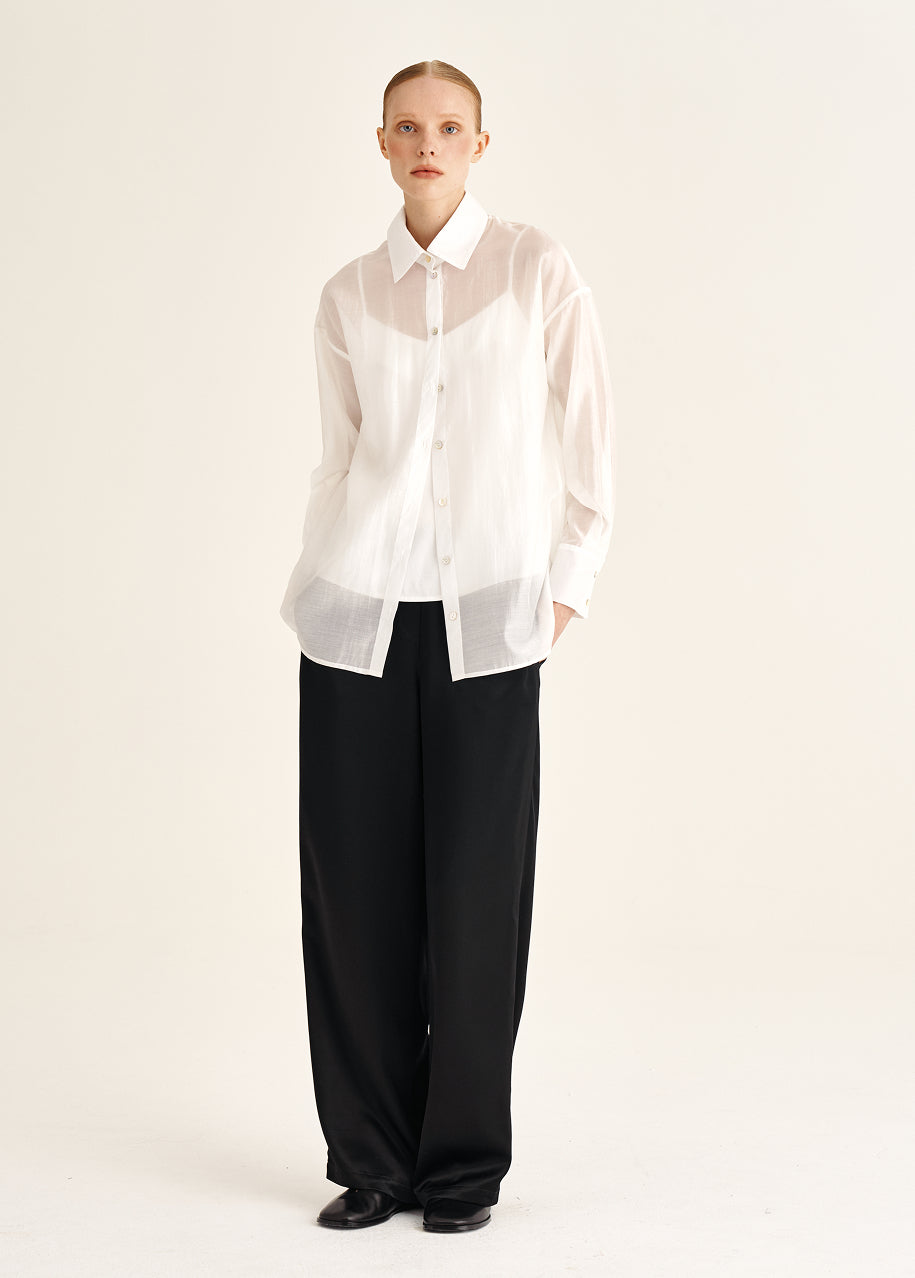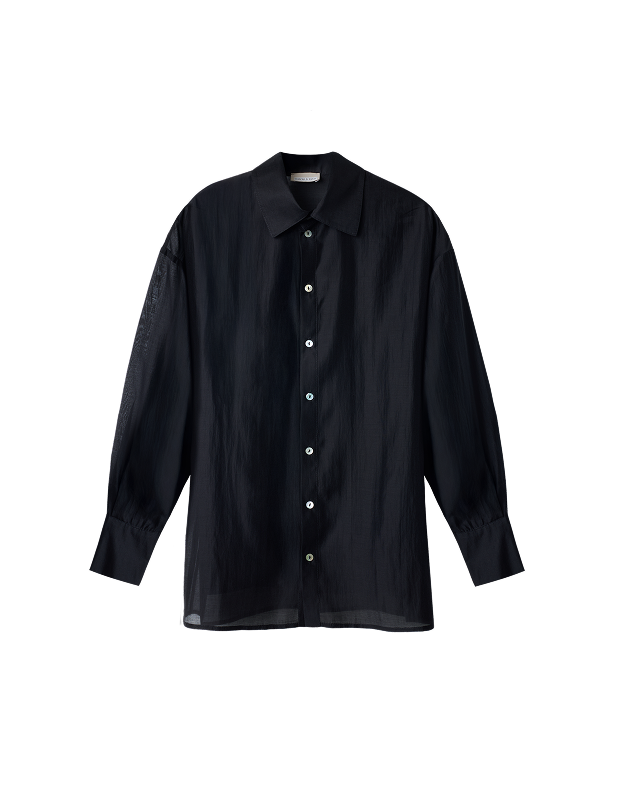 A tencel blouse with subtle transparency. Almost weightless to the touch, it creates a soft, luminous space around the body. Ideal for days when you want to reduce visual density and add lightness to the wardrobe.