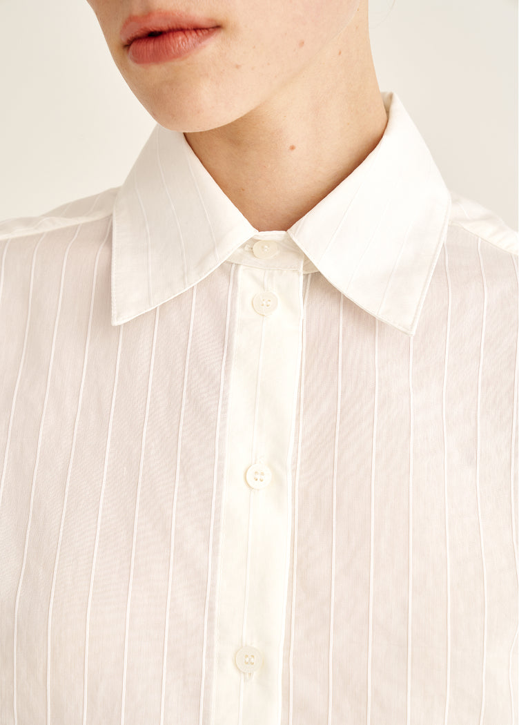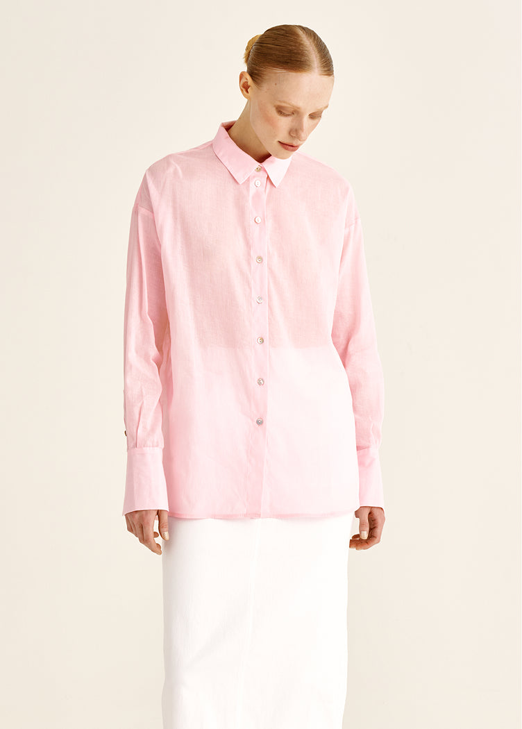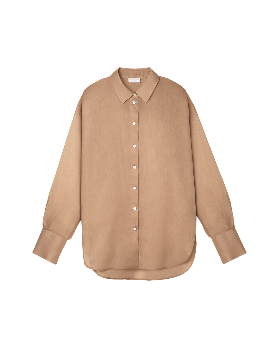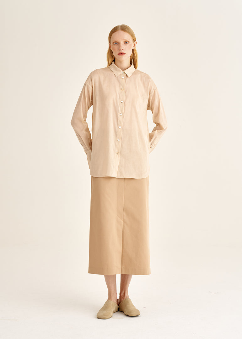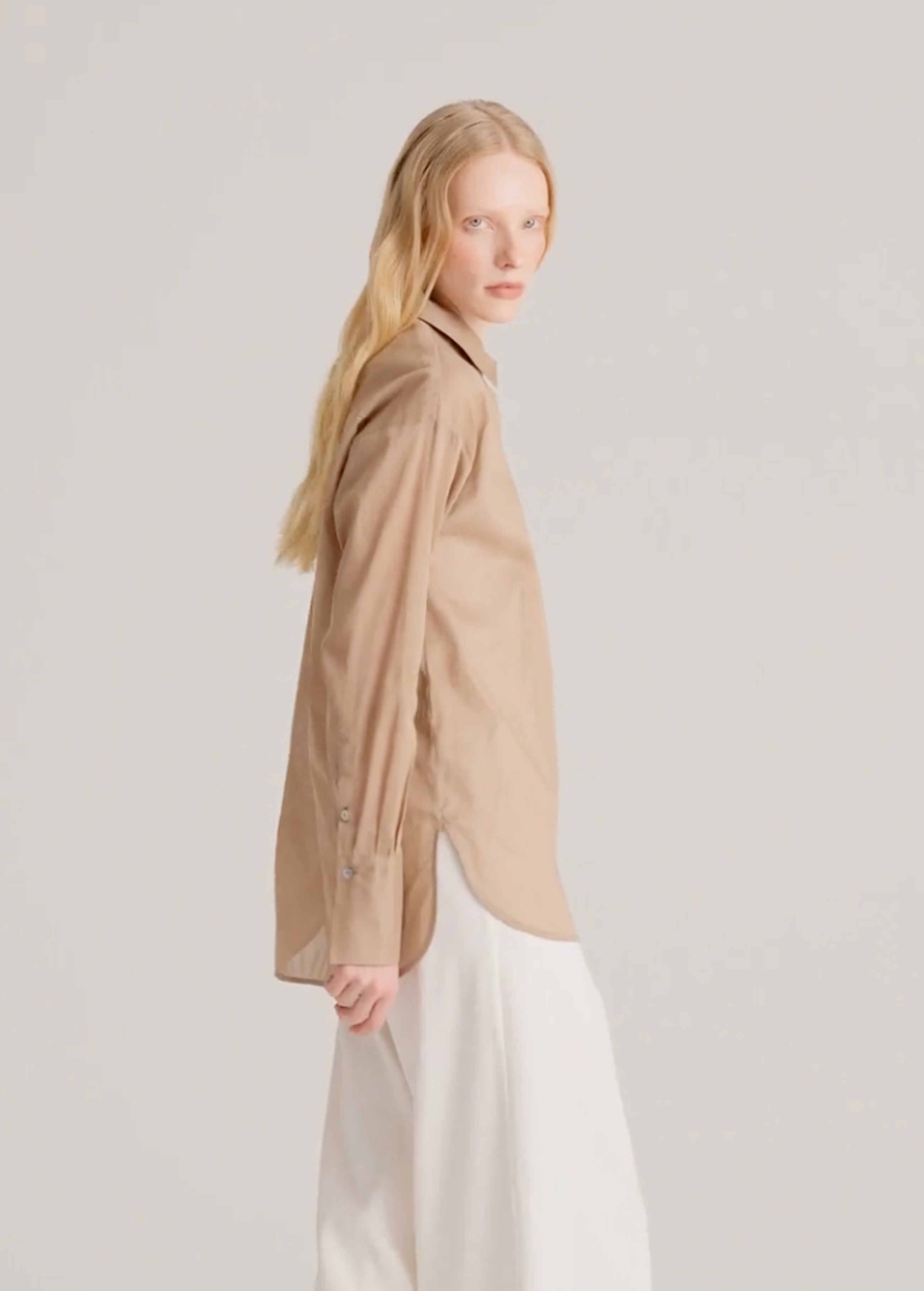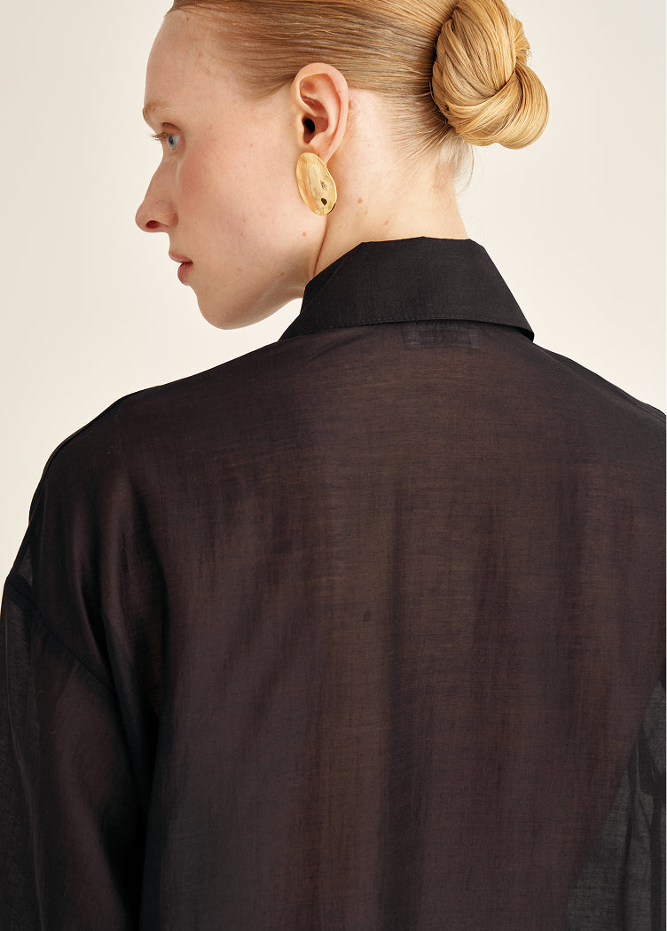 A tencel blouse with subtle transparency. Almost weightless to the touch, it creates a soft, luminous space around the body. Ideal for days when you want to reduce visual density and add lightness to the wardrobe.