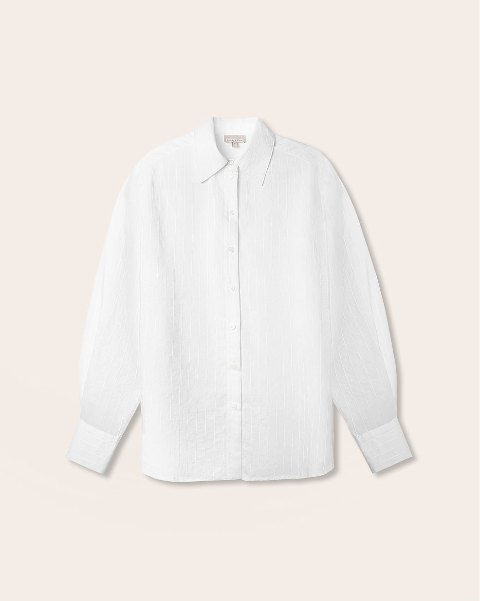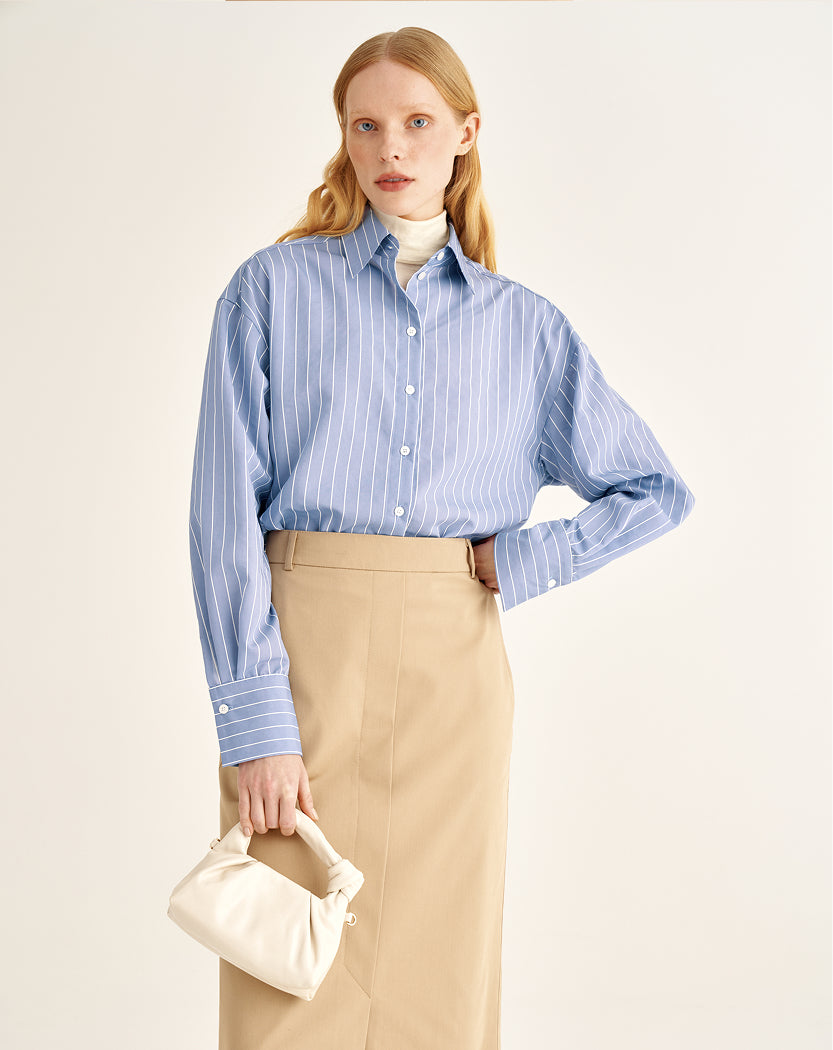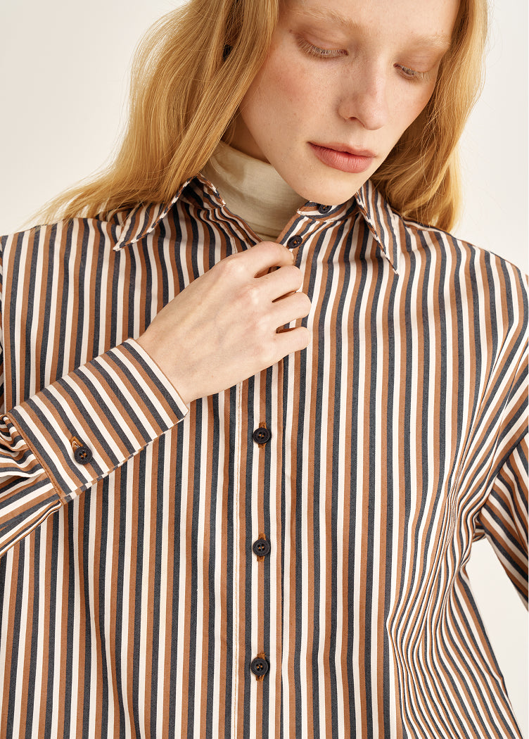 A model where hand craftsmanship becomes part of visual precision. The careful alignment of stripes at the cuffs and back reinforces the clarity of the silhouette, even with a relaxed fit. Three shades — white, brown, and blue — allow the mood of the look to shift depending on the day’s agenda.