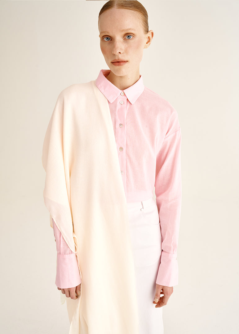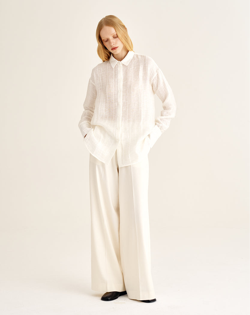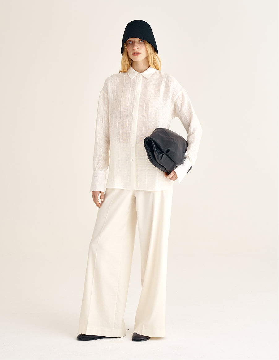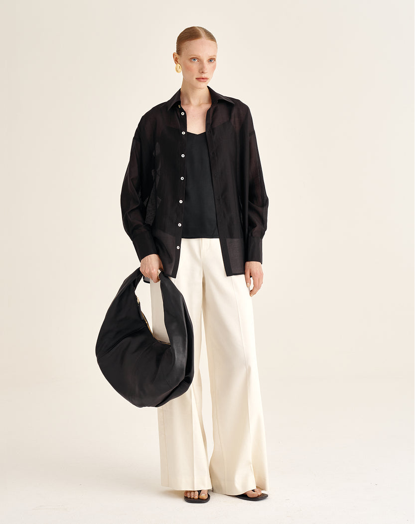 Linen and viscose woven together create a balanced texture: the fabric holds its shape yet remains fluid. A delicate silky sheen reveals itself in motion, lending the look a calm, composed elegance. Available in milk and black, the blouse responds subtly to the rhythm of the day and chosen context, shifting the tone from light and serene to more concentrated and grounded — always tactually quiet and confident.