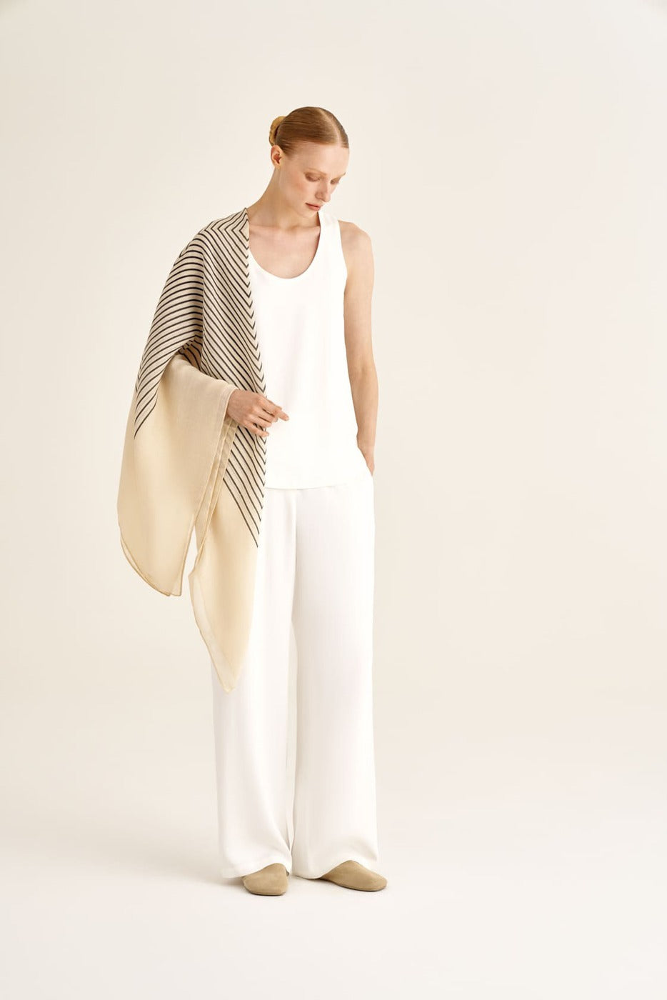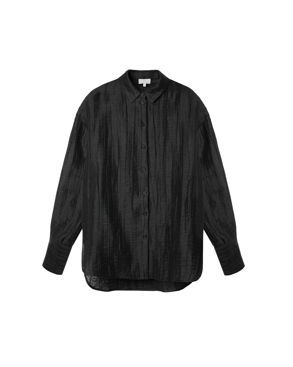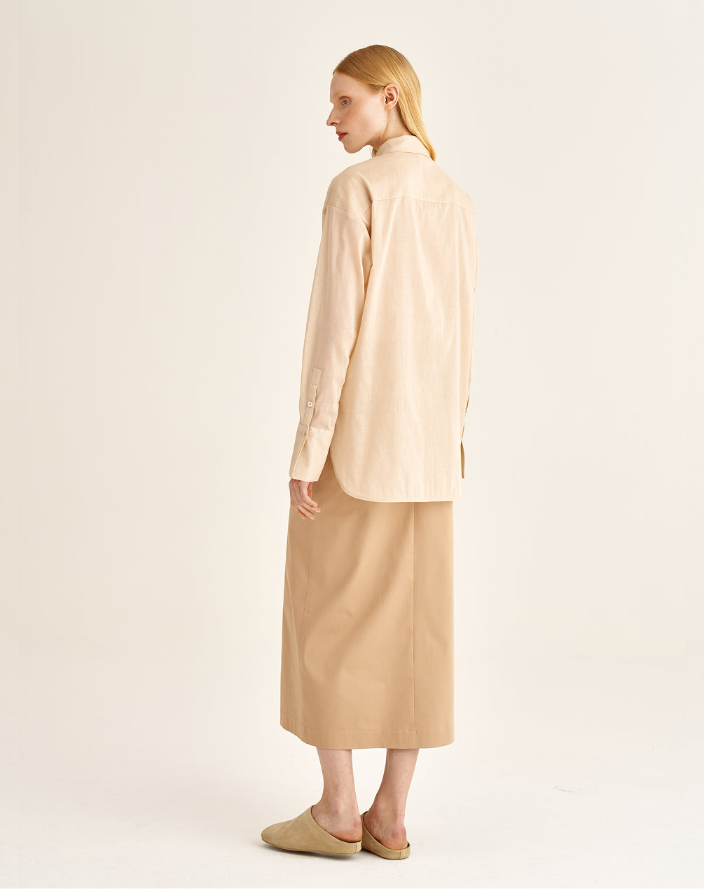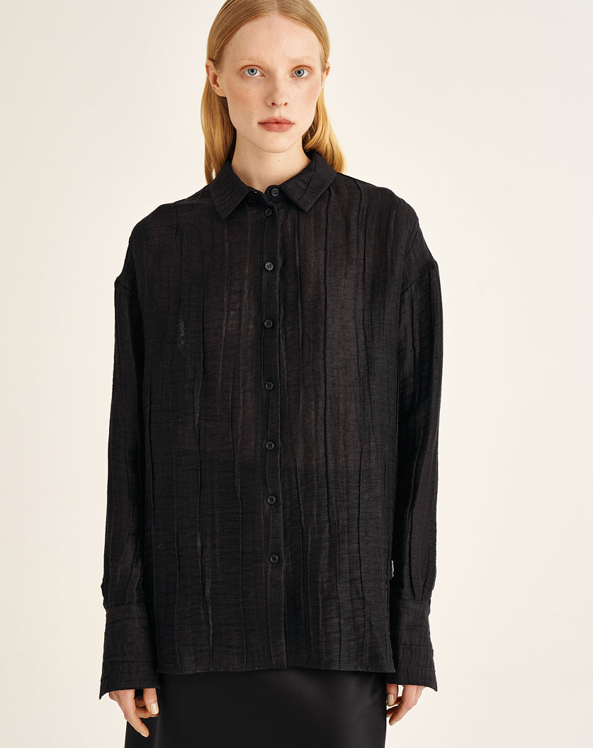 Linen and viscose woven together create a balanced texture: the fabric holds its shape yet remains fluid. A delicate silky sheen reveals itself in motion, lending the look a calm, composed elegance. Available in milk and black, the blouse responds subtly to the rhythm of the day and chosen context, shifting the tone from light and serene to more concentrated and grounded — always tactually quiet and confident.