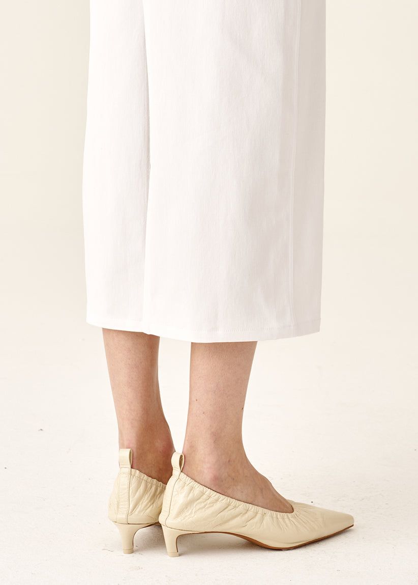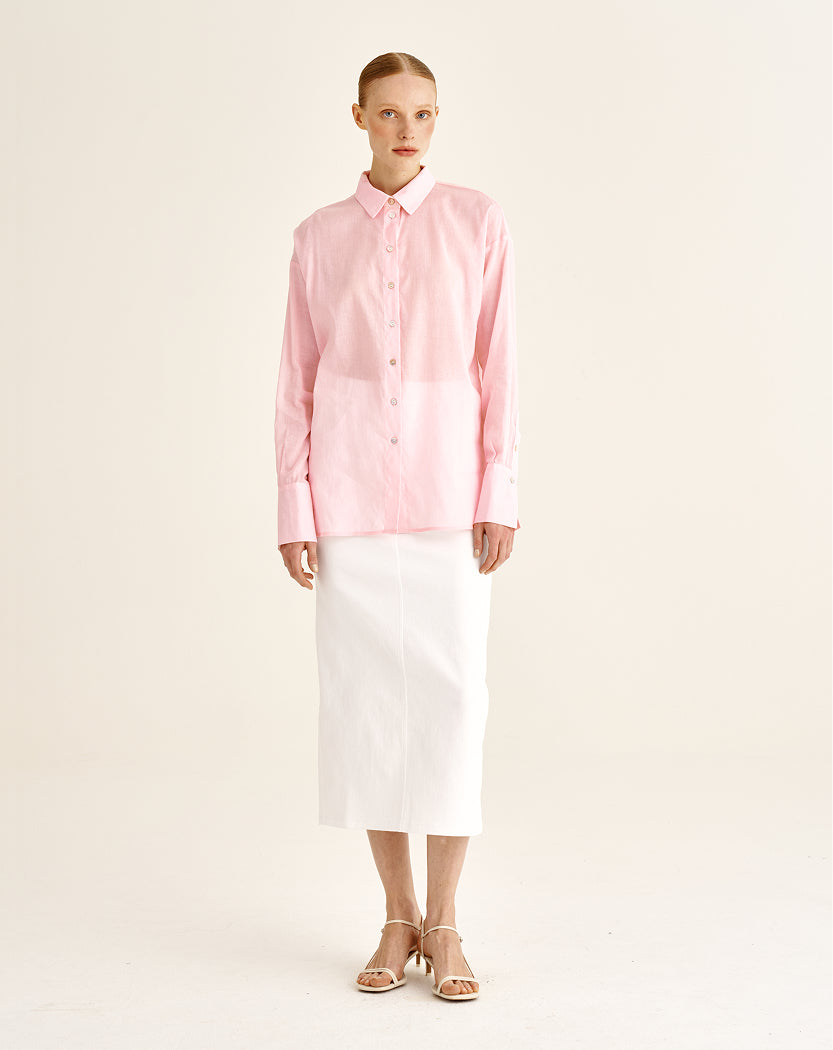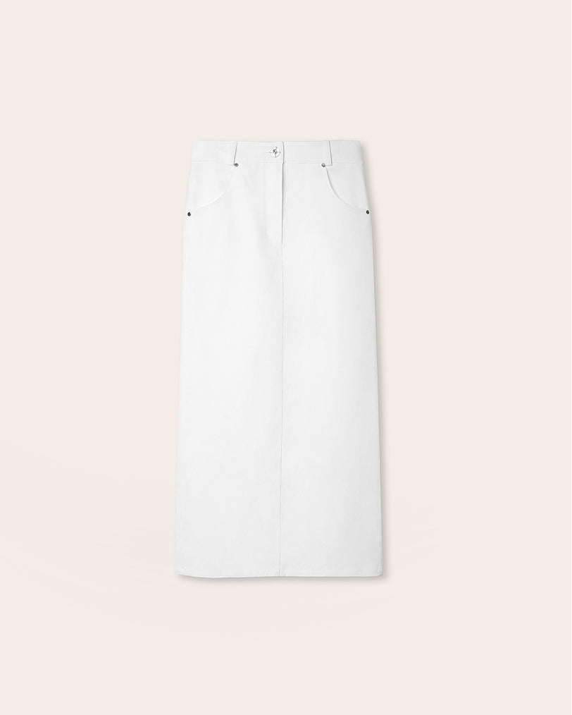 A white cotton skirt that retains its shape. Designer buttons introduce subtle accents without disrupting the minimalist aesthetic. Best revealed when paired with textured tops such as RAMI.