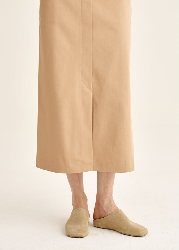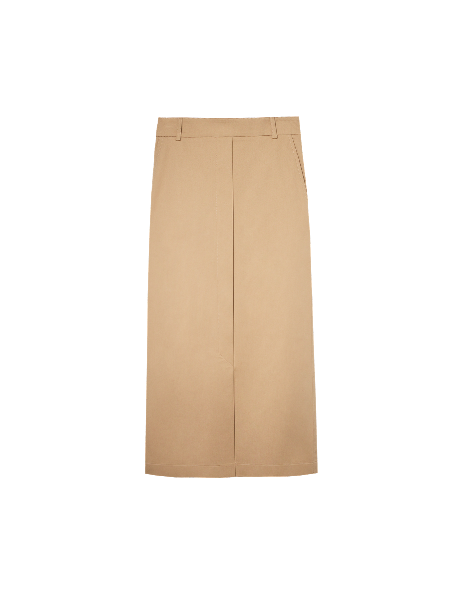 Dense cotton, a stable midi length, and a clean slit make this model relevant regardless of season. A universal base that works equally well with structured shirts and softer textures.