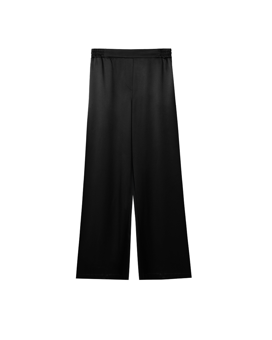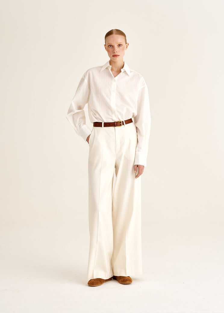 The color palette — milk and black — allows the trousers to integrate seamlessly into both light and more composed capsules. They pair effortlessly with structured shirts as well as softer, more fluid tops.
