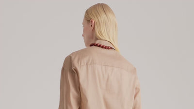 A nettle-fiber blouse for those who value natural texture. It creates a gentle volume that preserves a sense of freedom. Three shades — pink, beige, and brown — expand the capsule through nuance rather than sharp contrast.