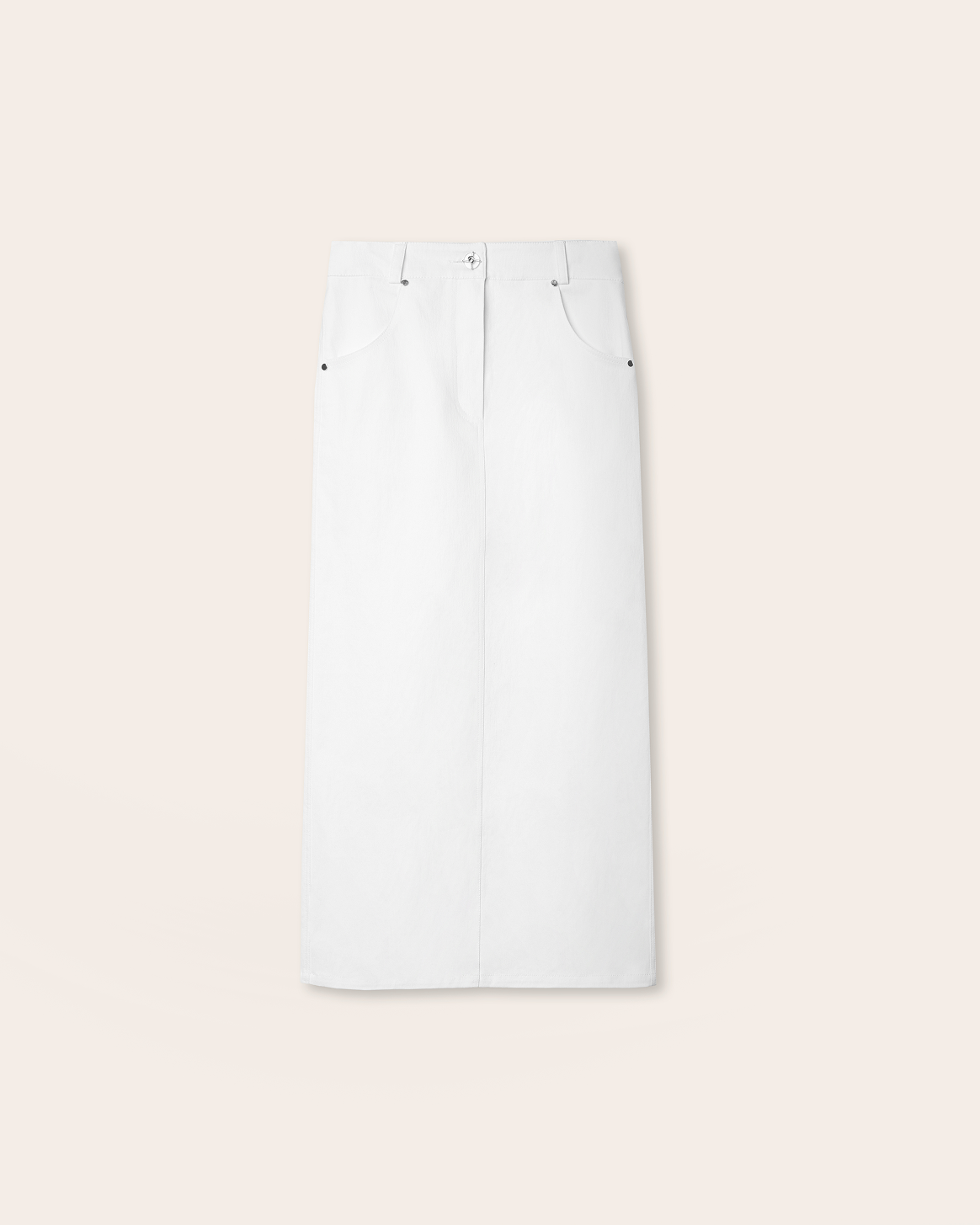 A pink shirt paired with a white denim skirt creates a gentle and romantic look. The pastel color scheme creates a feeling of lightness and freshness — an ideal choice for spring and summer days