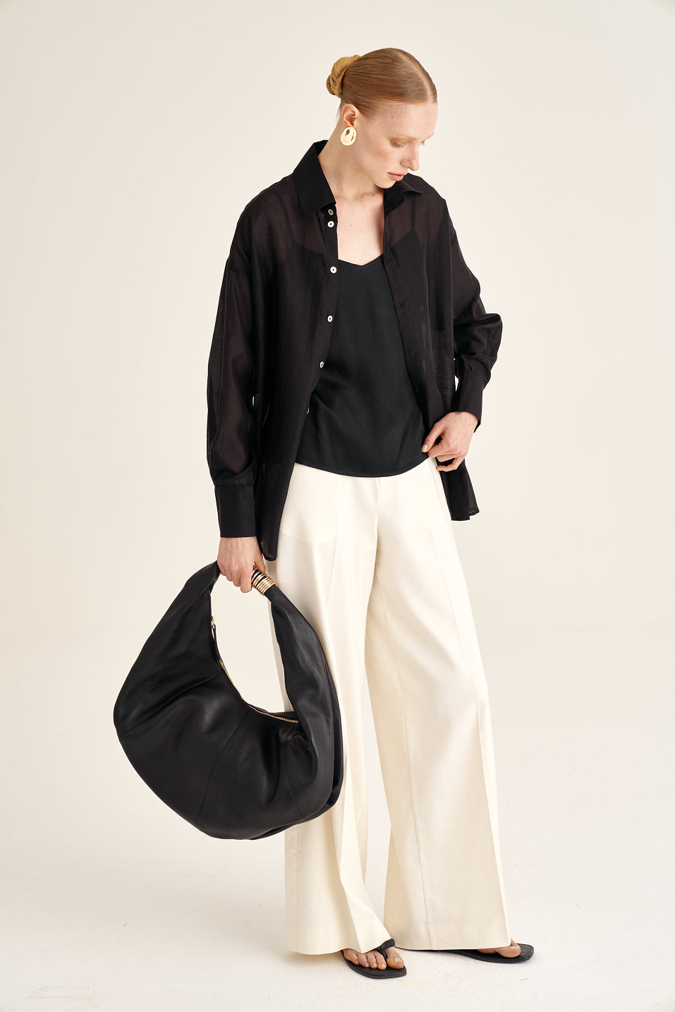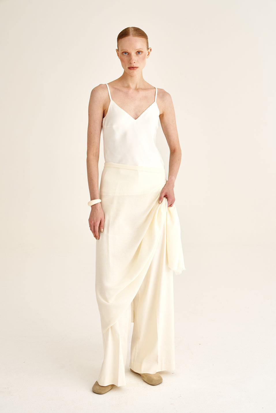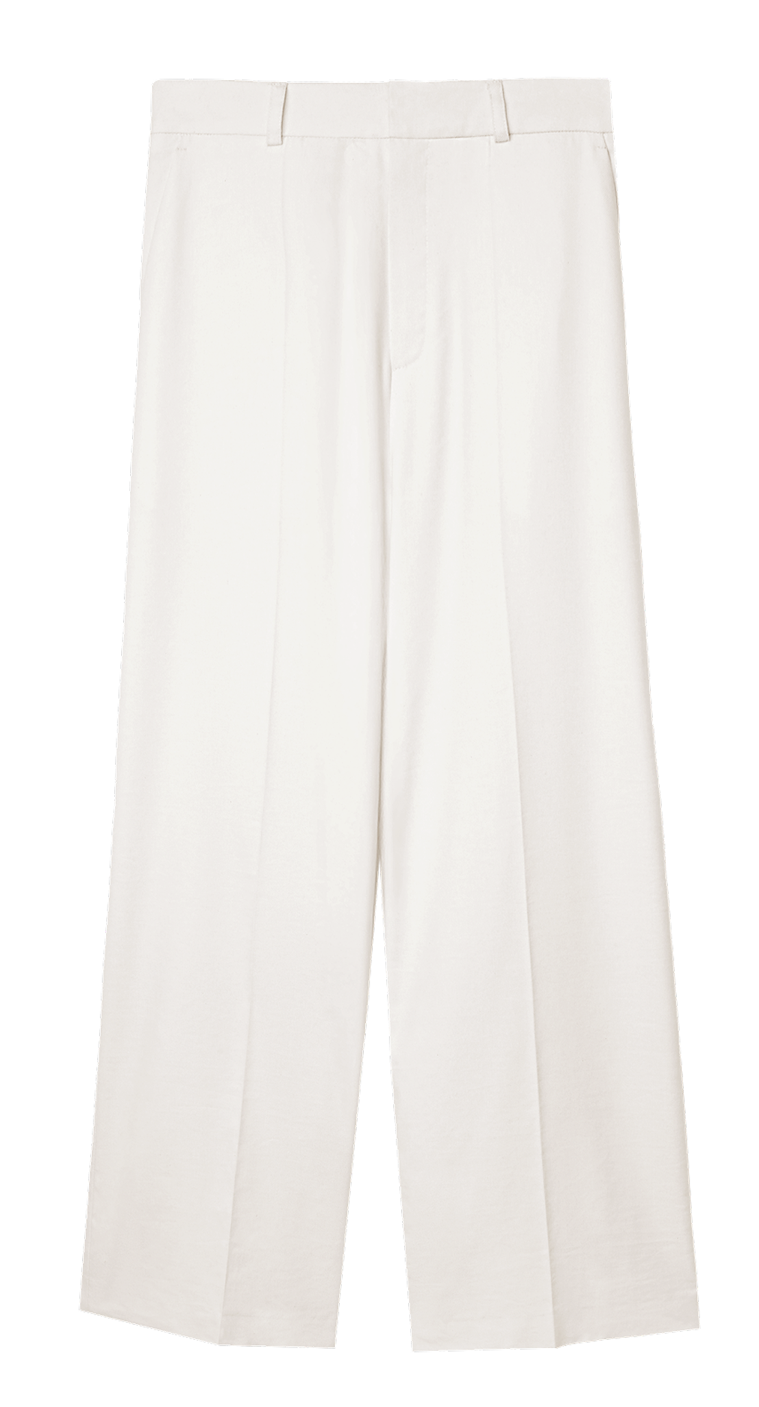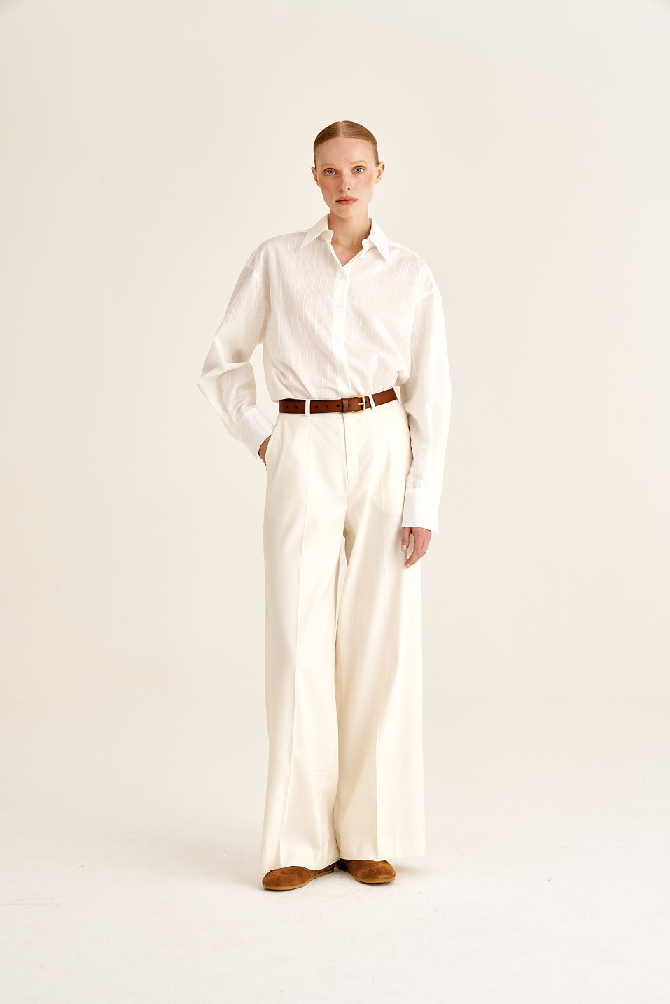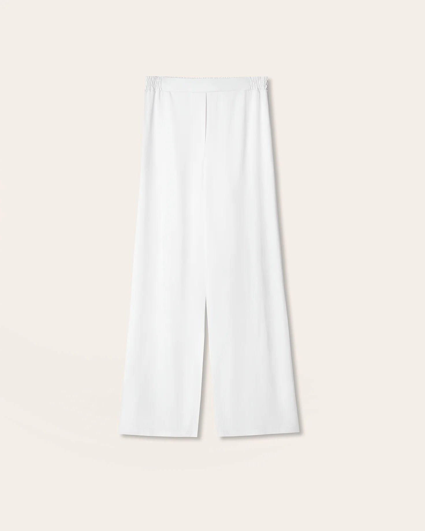 Milk palazzo pants are the perfect basic item for creating a stylish capsule. They easily fit into different looks, maintaining both elegance and lightness.