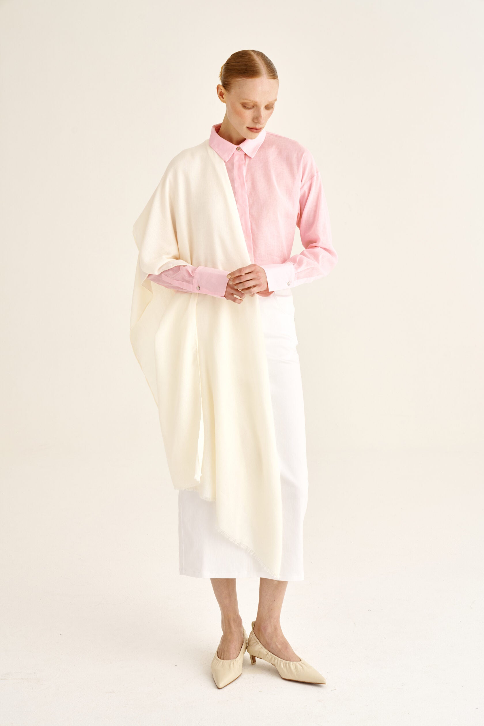 For an urban style, a black T-shirt, a sheer black shirt, and a simple bag create a look of modern minimalism. If you're in the mood for something softer, a pink linen shirt tucked in adds a gentle, sophisticated touch. And for a summery mood — a white T-shirt with a milk-colored stole tied at the waist: fresh, comfortable, and casual.