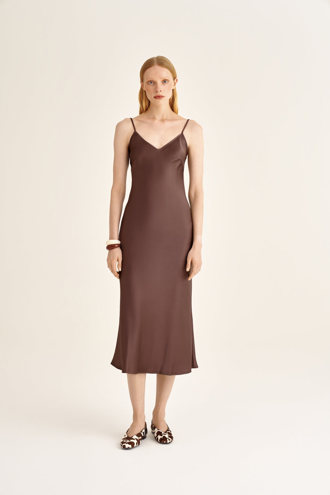 A chocolate slip dress is the perfect companion for a variety of occasions: walks, dates, and those moments when style should speak for itself. In each case, you can adapt the dress to the desired atmosphere.
