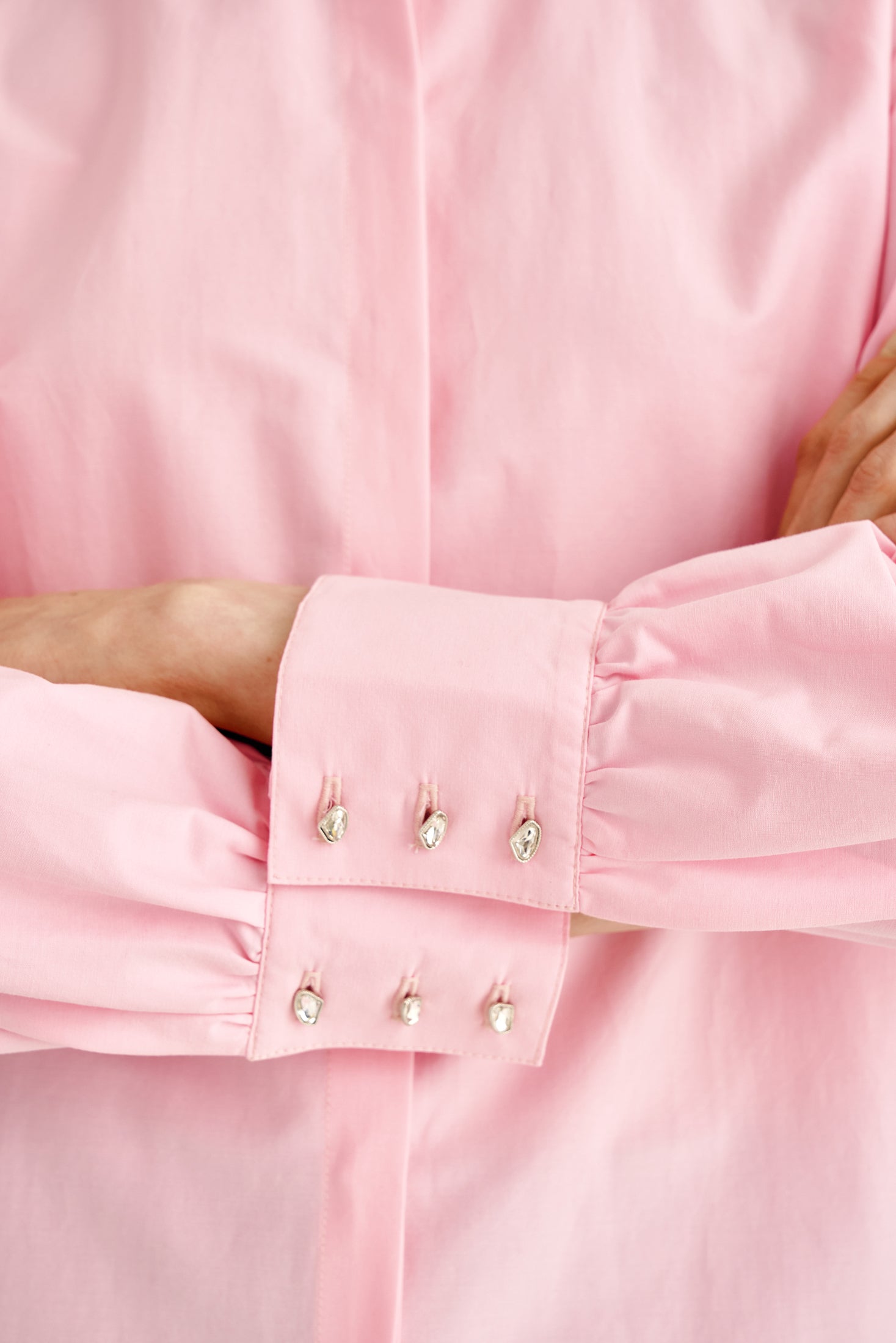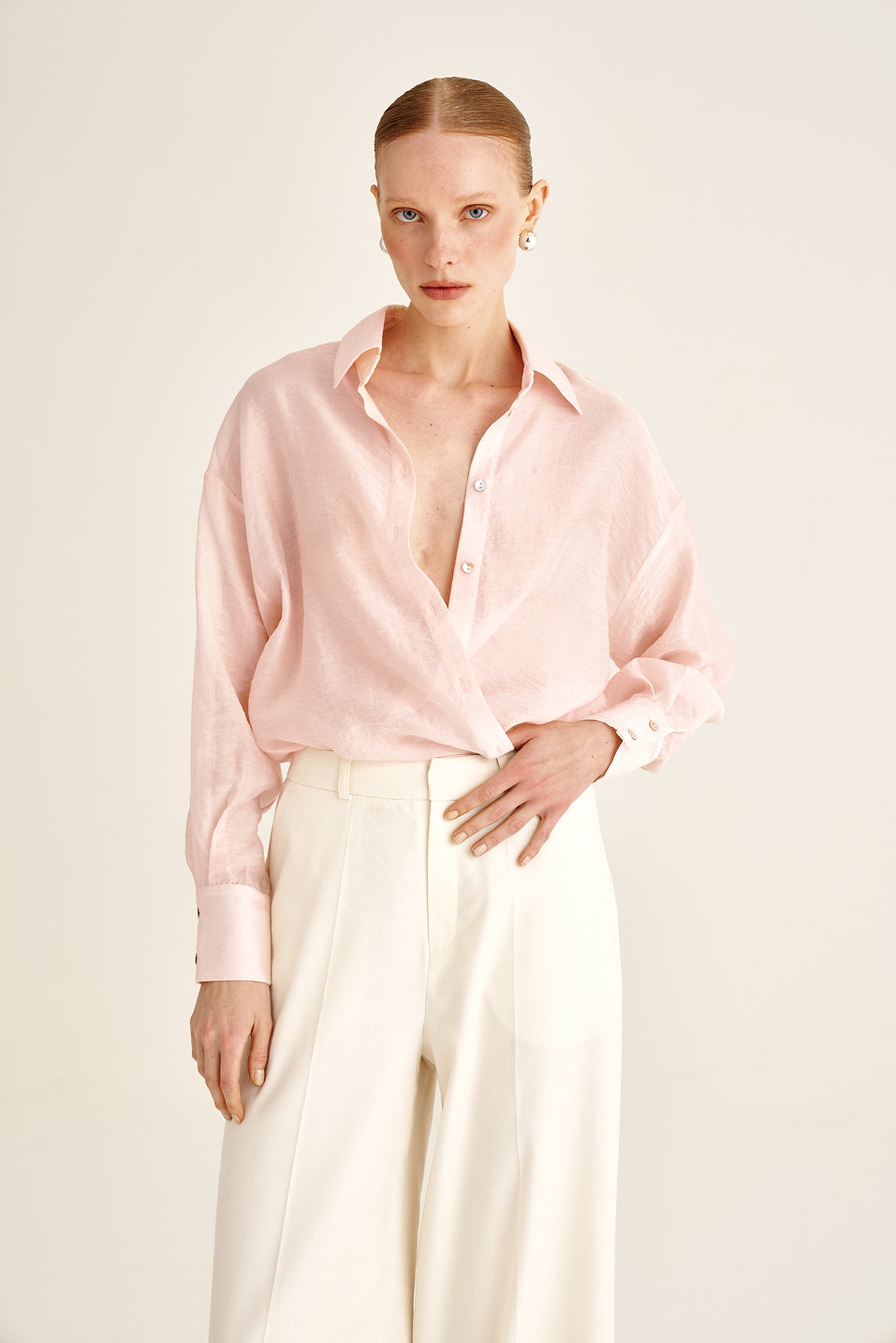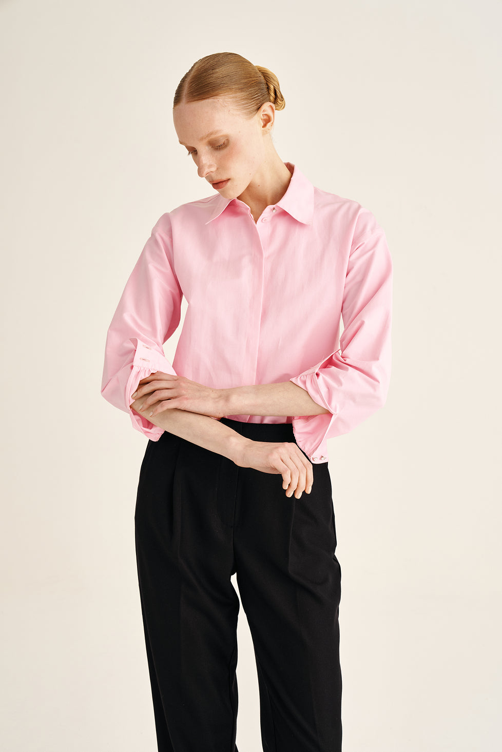 The second look is based on the spectacular combination of a pink shirt and black trousers. The deep black color emphasizes the richness of the pink, making the look expressive and confident.